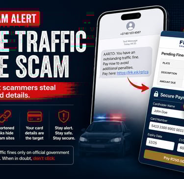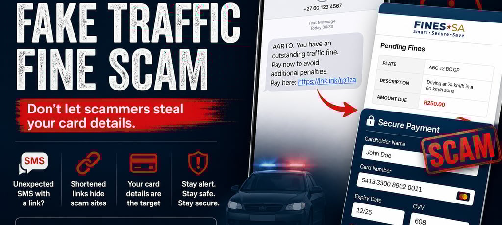 Category: Scam Alert · South Africa Published: April 2026 A new SMS phishing campaign is targeting South African motorists. The message claims you have an outstanding traffic violation that must be paid urgently, but it's a trap designed to steal your bank card information. The SMS contains a shortened link to hide the real destination and make the message appear legitimate.